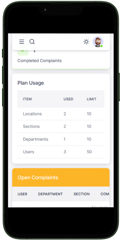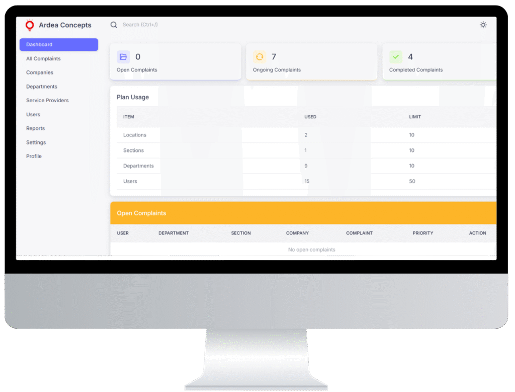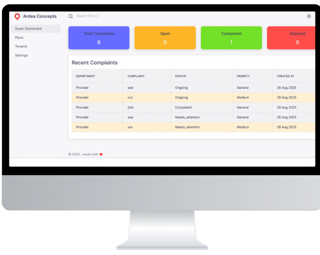 - Real-Time Dashboard – Monitor open, ongoing, and completed complaints across locations.