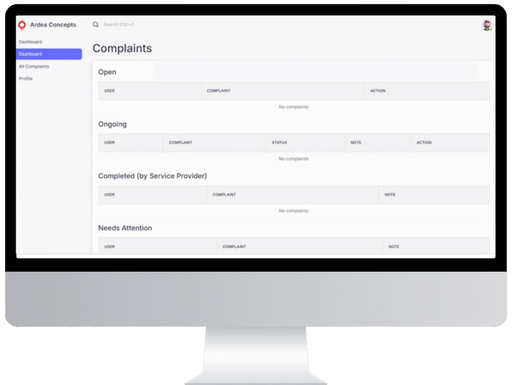 Track complaints through every stage—Open → Ongoing → Completed / Needs Attention → Approved / Rejected—to identify bottlenecks and measure turnaround times.